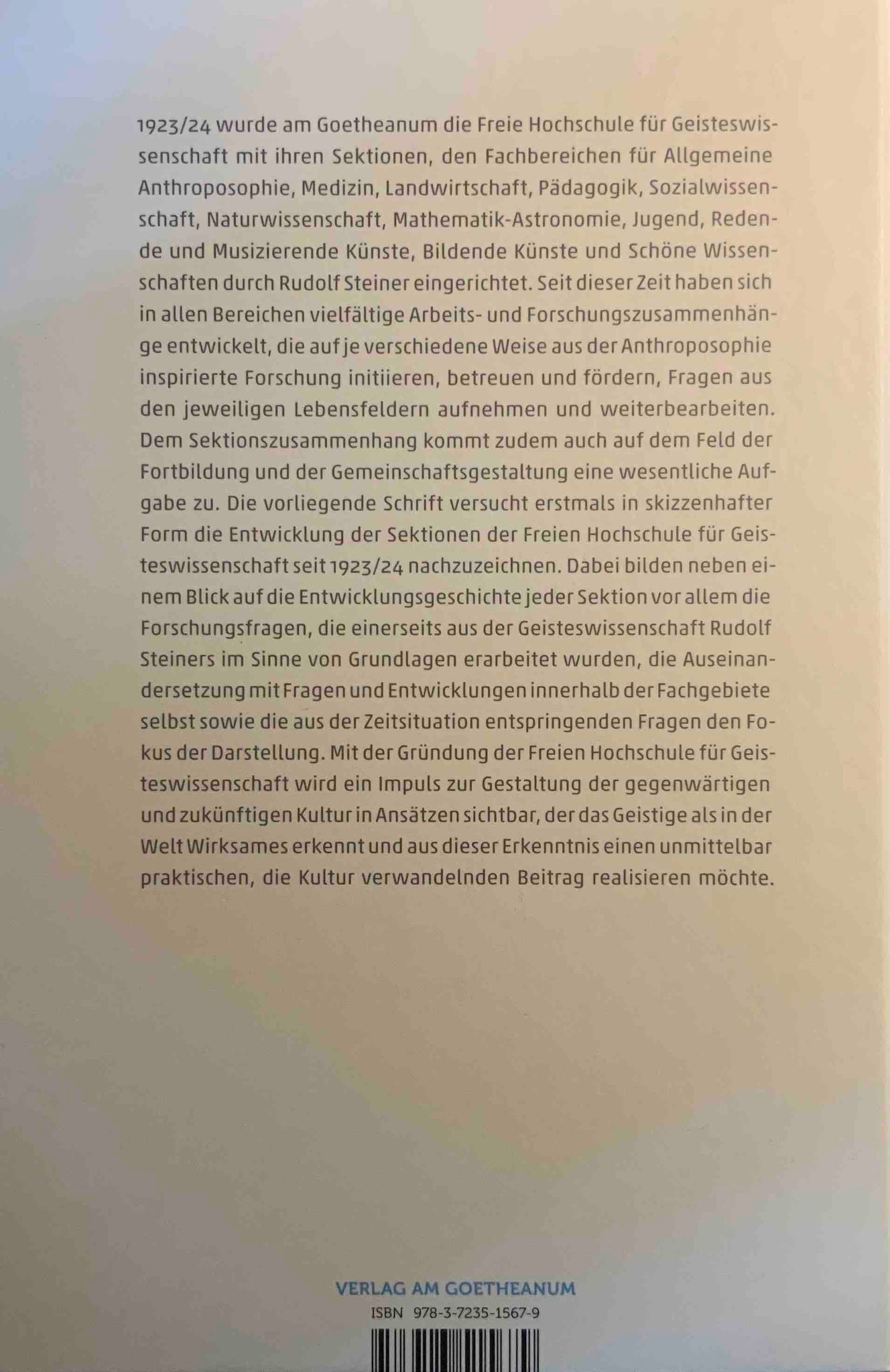 1923/24 wurde am Goetheanum die Freie Hochschule für Geisteswissenschaft mit ihren Sektionen, den Fachbereichen für Allgemeine Anthroposophie, Medizin, Landwirtschaft, Pädagogik, Sozialwissenschaft, Naturwissenschaft, Mathematik-Astronomie, Jugend, Redende und Musizierende Künste, Bildende Künste und Schöne Wissenschaften durch Rudolf Steiner eingerichtet. Seit dieser Zeit haben sich in allen Bereichen vielfältige Arbeits- und Forschungszusammenhänge entwickelt, die auf je verschiedene Weise aus der Anthroposophie inspirierte Forschung initiieren, betreuen und fördern, Fragen aus den jeweiligen Lebensfeldern aufnehmen und weiterbearbeiten. Dem Sektionszusammenhang kommt zudem auch auf dem Feld der Fortbildung und der Gemeinschaftsgestaltung eine wesentliche Aufgabe zu. Die vorliegende Schrift versucht erstmals in skizzenhafter Form die Entwicklung der Sektionen der Freien Hochschule für Geisteswissenschaft seit 1923/24 nachzuzeichnen.
