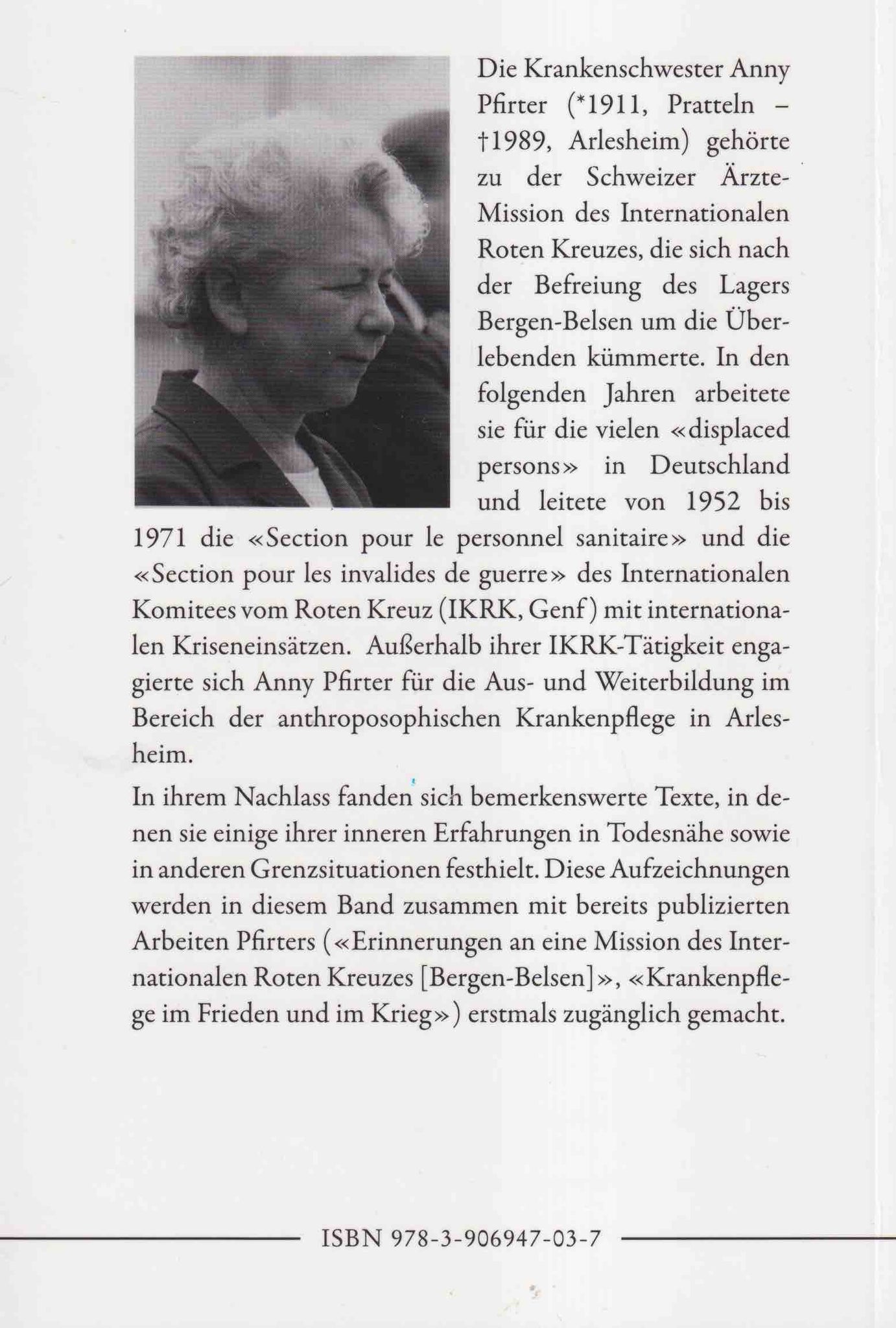Nach der Befreiung des Lagers Bergen-Belsen nahm sich das Internationale Rote Kreuz der Überlebenden an. Unter ihnen die Krankenschwester Anny Pfirter (1911, Pratteln – 1989, Arlesheim). In den folgenden Jahren arbeitete Pfirter für die vielen «displaced persons» in Deutschland und leitete von 1952 bis 1971 die «Section pour le personnel sanitaire» und die «Section pour les invalides de guerre» des Internationalen Komitees vom Roten Kreuz (IKRK, Genf) mit internationalen Kriseneinsätzen. Außerhalb ihrer IKRK-Tätigkeit engagierte sich Anny Pfirter für die Aus- und Weiterbildung im Bereich der anthroposophischen Krankenpflege in Arlesheim.