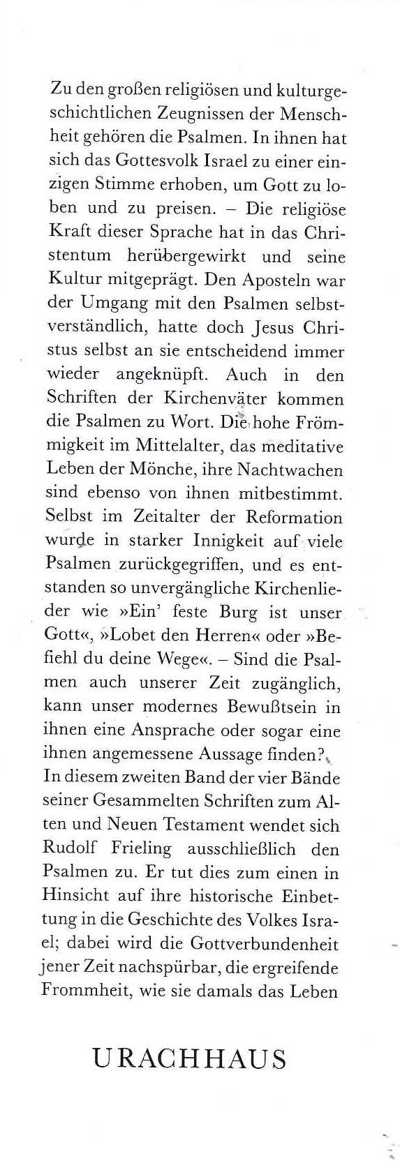 In diesem zweiten Band der vier Bände seiner Gesammelten Schriften zum Alten und Neuen Testament wendet sich Rudolf Frieling ausschließlich den Psalmen zu. Er tut dies in Hinsicht auf ihre historische Einbettung in die Geschichte des Volkes Israel; dabei wird die Gottverbundenheit jener Zeit nachspürbar, die ergreifende Frommheit, wie sie damals das Leben gestalten konnte, noch an der Grenze aller Hellsicht und doch visionär schon geistiger Zukunft zugewandt. Frielings Beobachtungen entzünden sich am hebräischen Text; immer wieder kann er die Wortbedeutung aufschlüsseln, dass eine weitere Schicht ihrer Bilder eröffnet wird. Mit den Psalmen entsteht der altjüdische Fromme vor dem Blick, der menschheitlich sein Gebet an Gott richtet, über sein Individuelles und über seine Zeit hinaus, für einen jeden gültig.